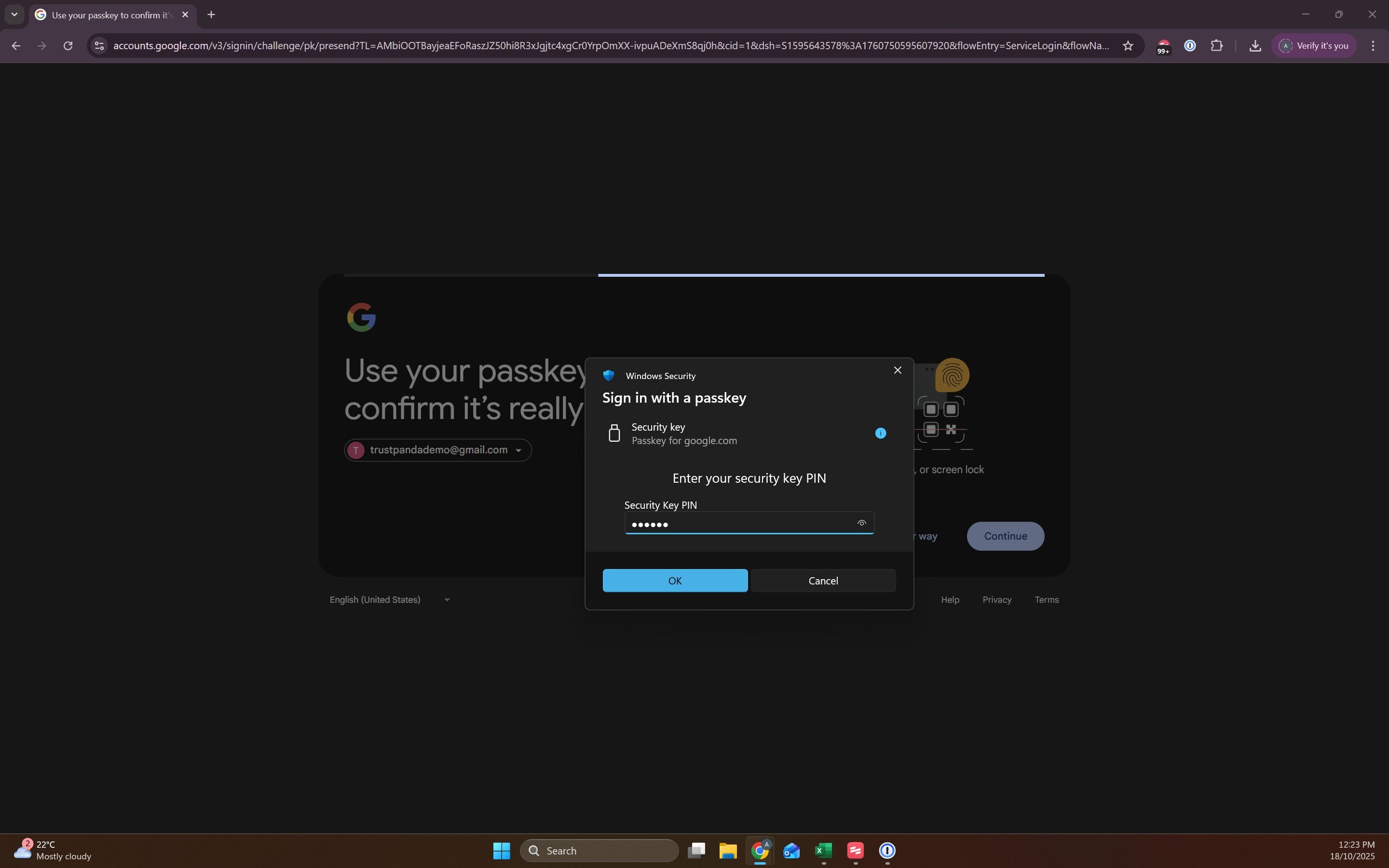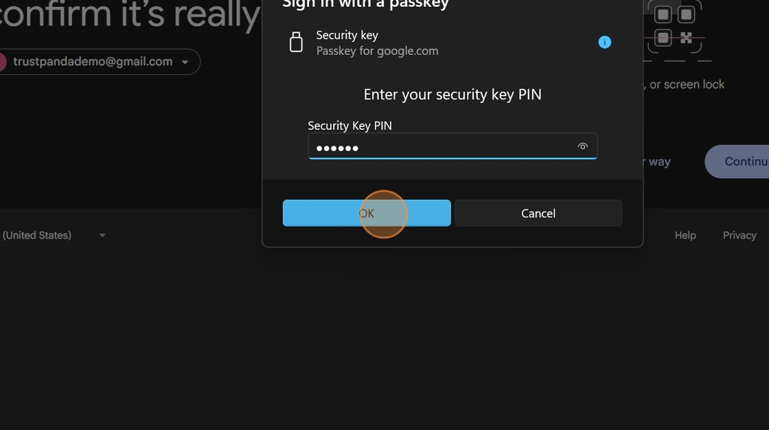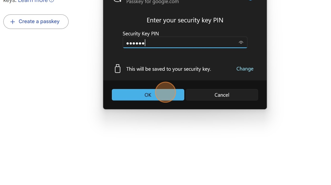 9. Enter a FIDO PIN. and Click "OK". You will need to remember this PIN as you'll need it each time you want to log in to your Google Account with your YubiKey.