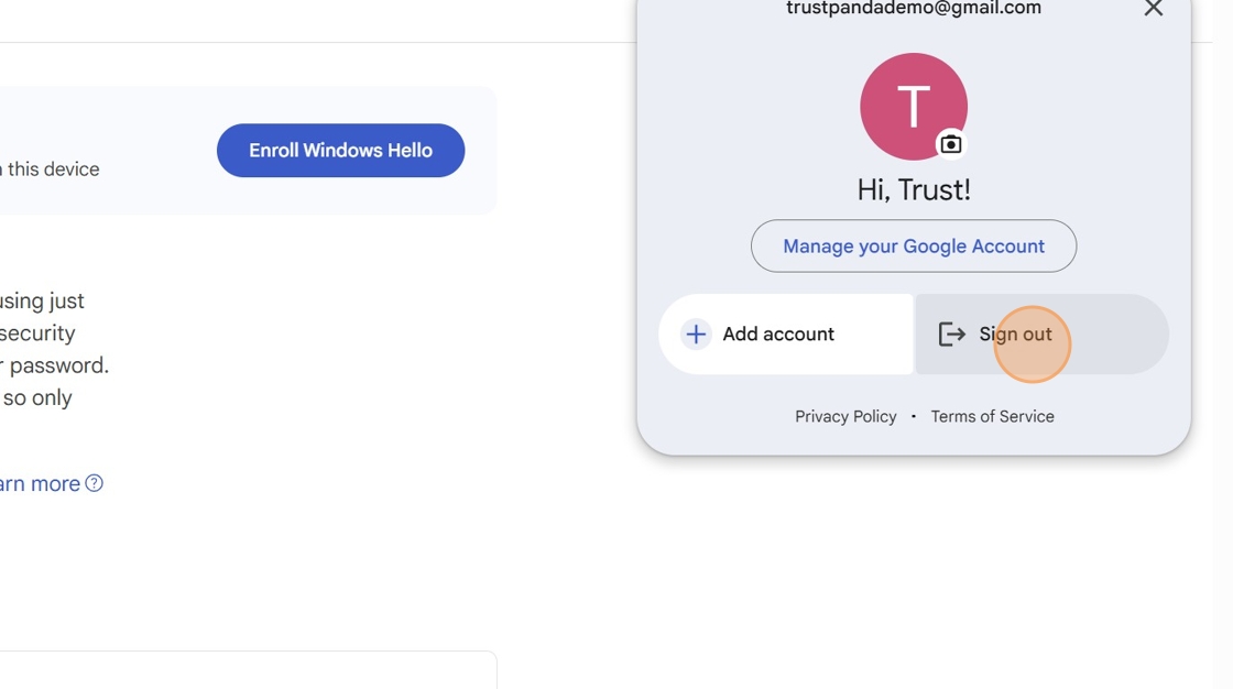 11. Now to test drive the login experience with your YubiKey. Click on your profile icon in the top right corner of the Google Account Window.