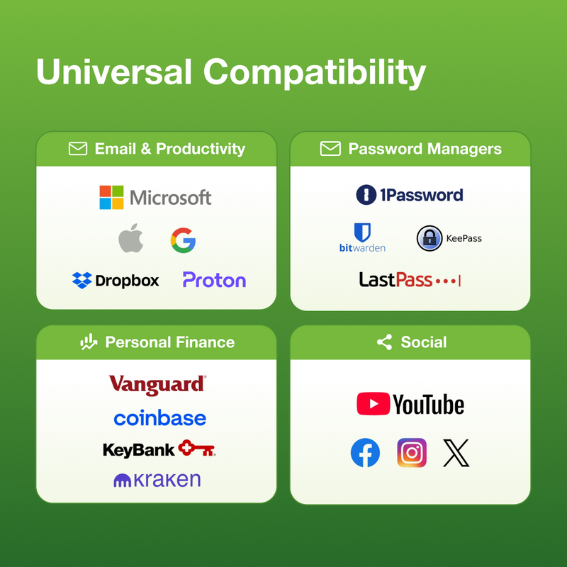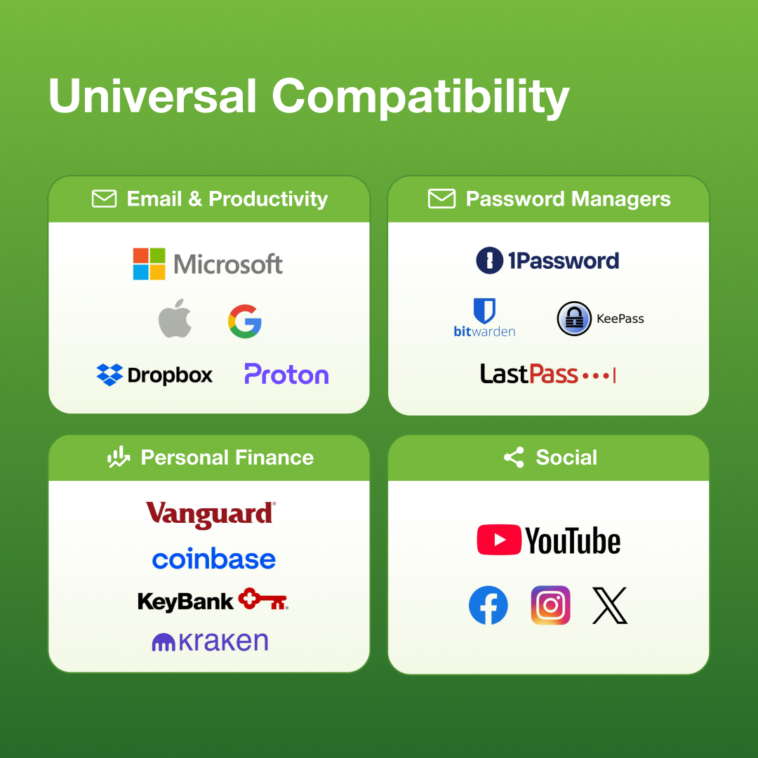 Jelentkezzen be biztonságosan bármilyen kompatibilis eszközről, beleértve az asztali számítógépet, laptopot vagy mobiltelefont. Egyetlen kulcs védi az összes fiókját az adathalászattól és a jogosulatlan hozzáféréstől.