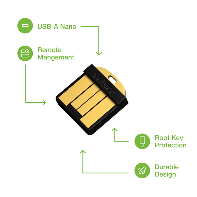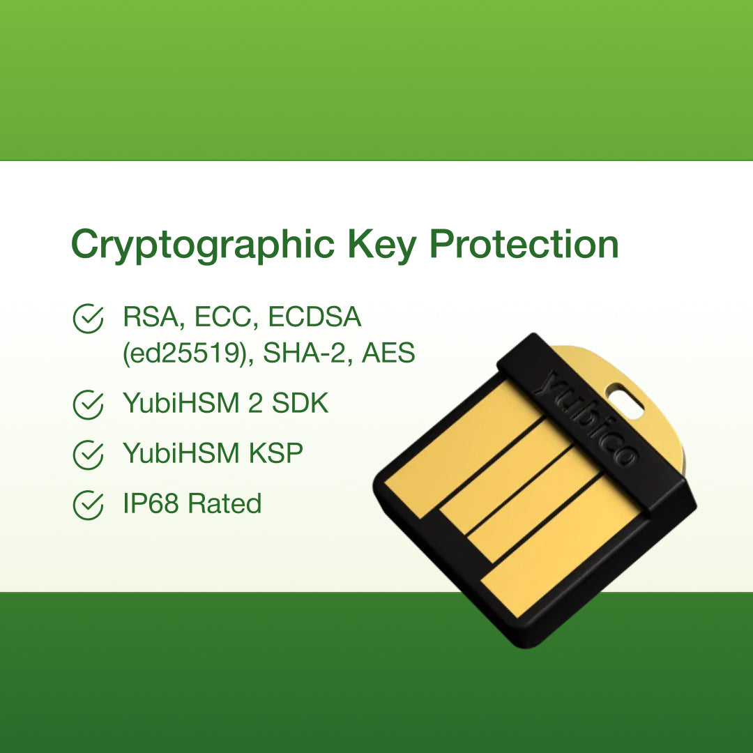 The YubiHSM 2 is a compact hardware security module (HSM) that safeguards cryptographic keys used in servers and applications. It protects Certificate Authority root keys and digital signatures against theft or misuse.