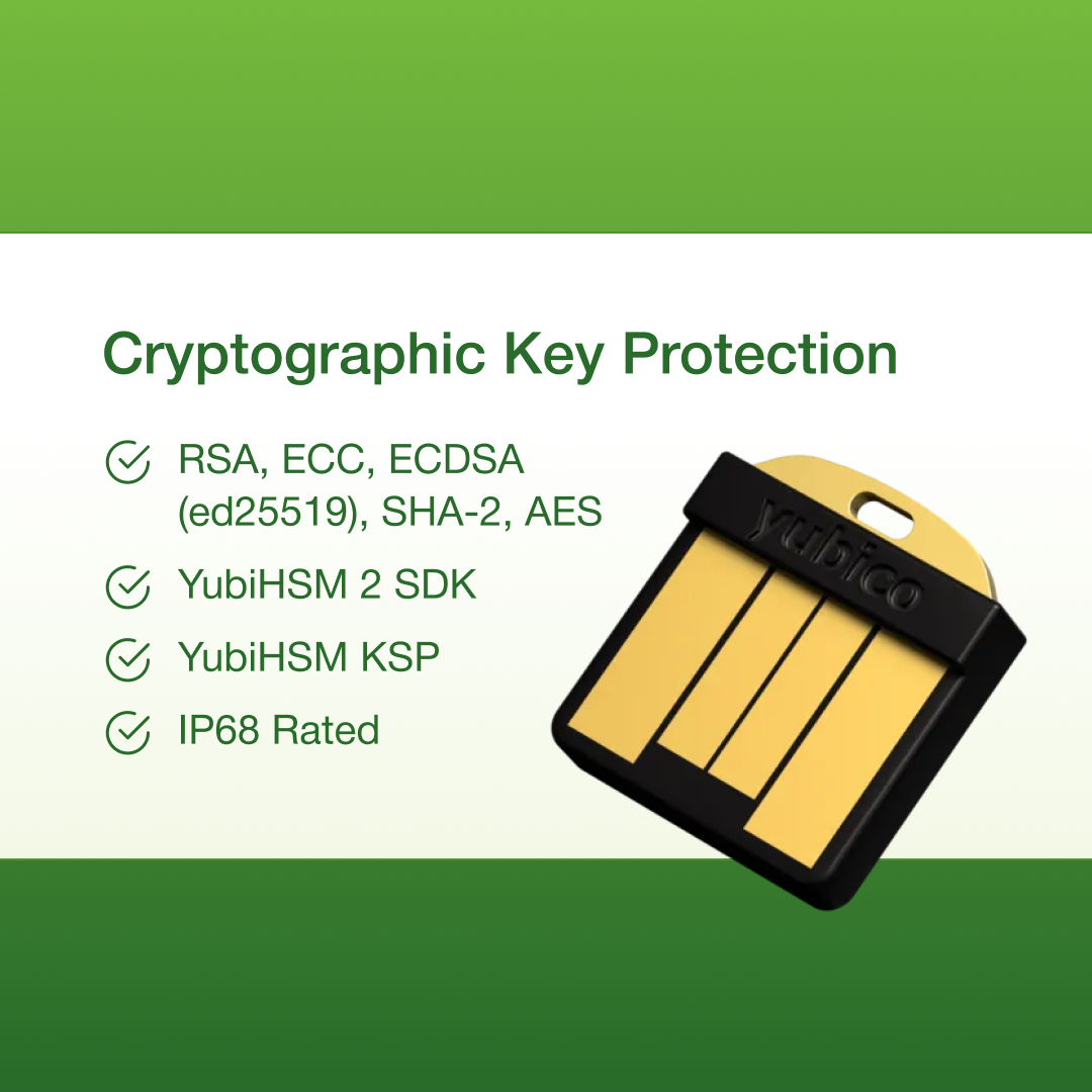 The YubiHSM 2 FIPS is a FIPS 140-2 Level 3 validated hardware security module, offering enterprise-grade cryptographic key protection and lifecycle management.